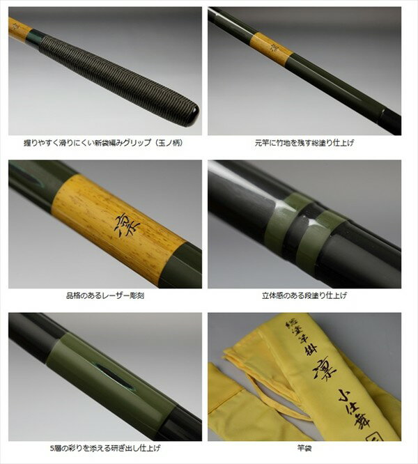 標準全長 (m) 2.2 継数 (本) 3 仕舞 (cm) 115 標準自重 (g) 210 竿受/弓受 (mm) 7.5 / 12.0 漆黒の本体色に緑の段塗りを施し、そこに見える研ぎ出しが味わい深い趣を生んでいる。竿掛は4通りの組み合わせで幅広く対応。