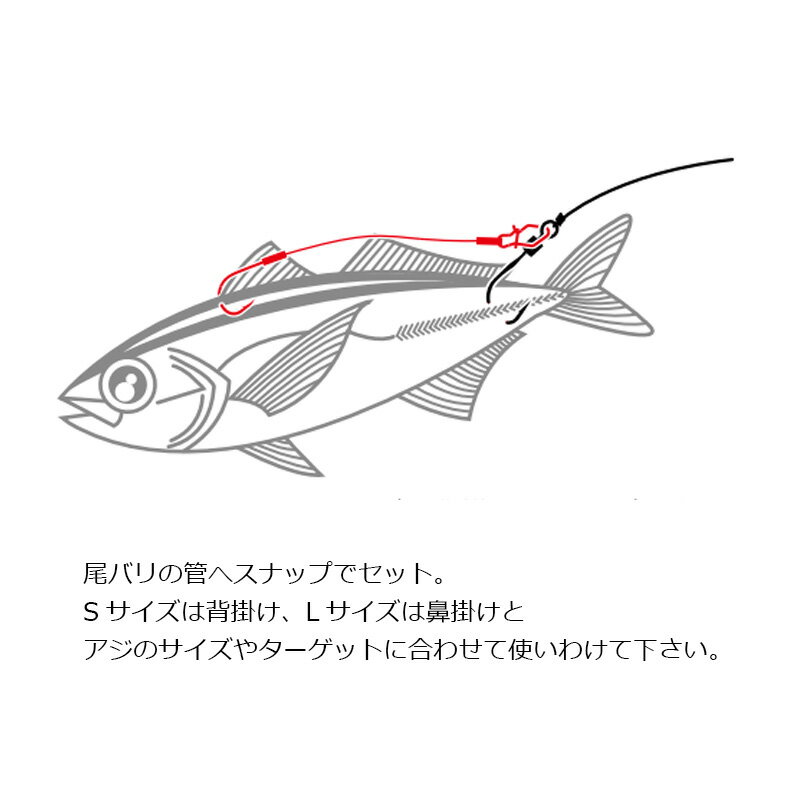 説明 :仕様表魚も獲れ〜る、ヤエン釣りで高級魚をゲット!ヤエン釣りで青物やスズキ等に餌アジをひったくられた経験はありませんか?「獲れ〜るフック」は尾バリの管へスナップでセット。ワンタッチで泳がせ・のませ仕掛にチェンジできるサポートフックです。ヤエン釣りでの外道は青物、スズキ、ヒラメやマゴチ等々と高級魚ばかり。通常の仕掛では掛かりにくい魚のゲット率が大幅UP!そのままアオリイカ狙いも可能です。●尾バリの管へスナップでセット。Sサイズは背掛け、Lサイズは鼻掛けとアジのサイズやターゲットに合わせて使いわけて下さい。●ナイロンコート●ハリ:管付チヌ、エギングスナップKATSUICHIカツイチ IP-41 獲れ〜るフック Type1●サイズ:M●ハリ:4●ワイヤー:#48●長さ:10cm●カラー:NSブラック詳細はこちら
