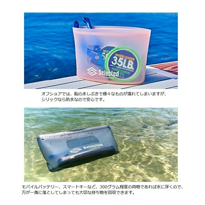 説明 :仕様表シリコン製のジップ付き防水マルチポーチ船上でスマホやスマートキーなど水に濡れてほしくない物の保管に最適。オフショアでは船の水しぶきで様々な物が濡れてしまいますが、シリックなら防水なので安心です。スマホとプライヤーなど300g程度の荷物であれば水に浮くので、万が一海に落としてしまっても大切な持ち物を回収できます。また、素材がシリコン製なので柔らかく、中のものを衝撃から保護してくれます。使用済みルアー、プライヤー、ラインカッターの一時保管として、あるいは食べ物、スマホ、鍵、エサ等々、シリックに入れるもののバリエーションは無限大です。Jackson Slickジャクソン シリック●カラー:WHT ホワイト●サイズ:W220mm×D65mm×H135mm詳細はこちら